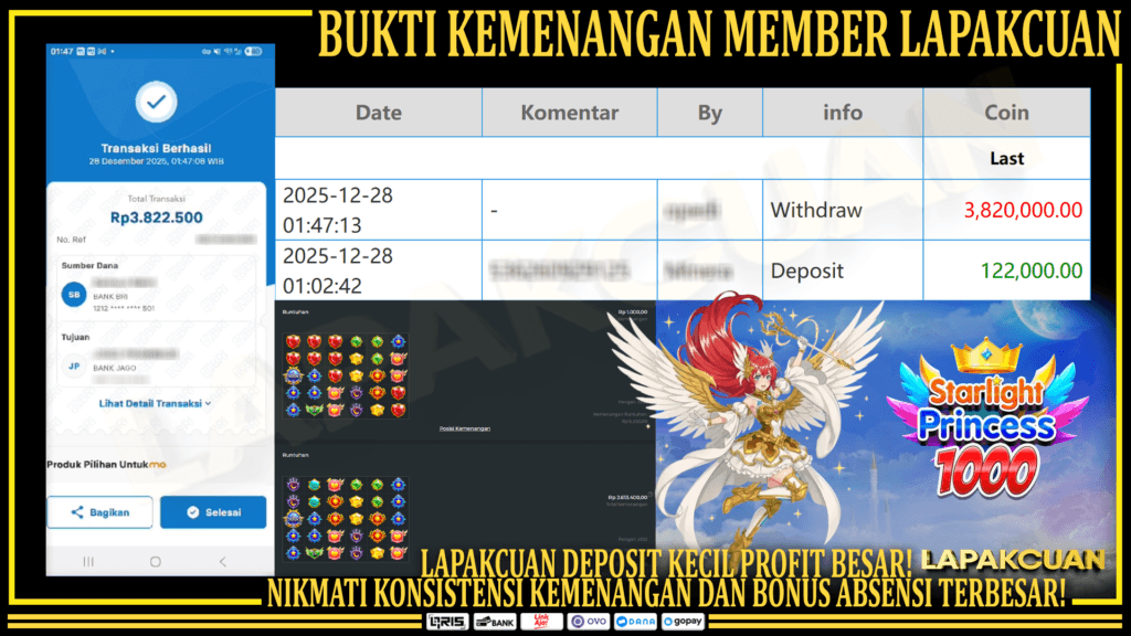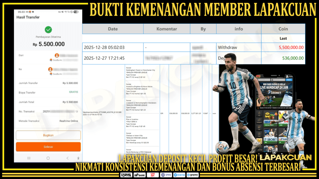 Setiap hari, LAPAKCUAN dipenuhi laporan kemenangan dari member aktif. Bukti kemenangan hari ini menunjukkan berbagai nominal hasil, mulai dari kemenangan kecil yang konsisten hingga kemenangan besar yang membuat saldo melonjak drastis. Hal ini membuktikan bahwa semua pemain memiliki peluang yang sama untuk menang, baik pemula maupun pemain berpengalaman.