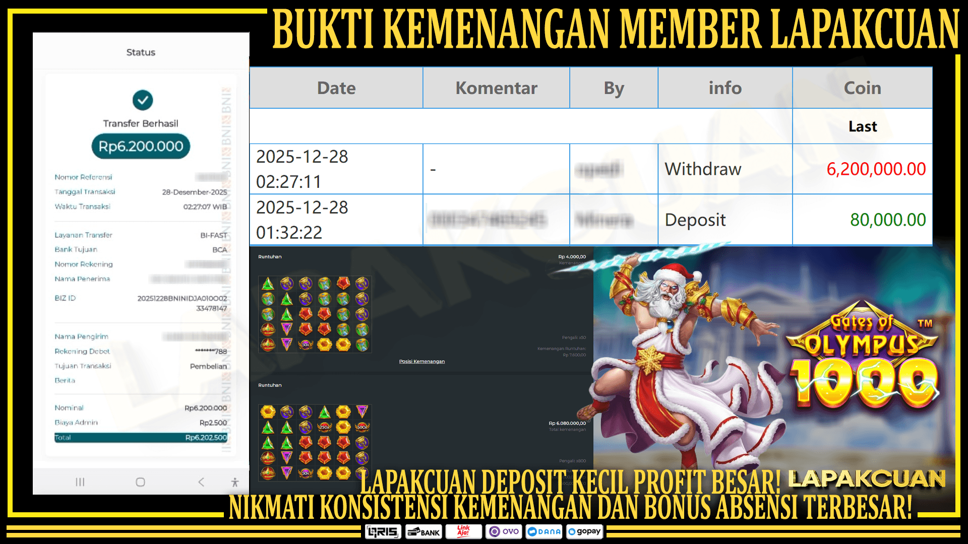 Bukti kemenangan hari ini di LAPAKCUAN menjadi bukti nyata bahwa platform ini benar-benar memberikan peluang cuan bagi para pemainnya. Dengan pilihan permainan lengkap, fitur bonus aktif, promo menarik, serta sistem yang aman, LAPAKCUAN layak menjadi tempat bermain bagi siapa saja yang ingin merasakan kemenangan nyata.