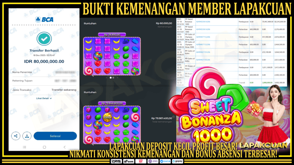 Lapakcuan – Dunia permainan daring selalu menawarkan sensasi yang tak tertandingi, terutama ketika kita berbicara tentang potensi kemenangan besar. Salah satu tempat yang kini menjadi sorotan bagi para pencari keberuntungan adalah Lapakcuan. Platform ini telah membuktikan diri sebagai wadah yang solid bagi para pemain untuk mengejar profit maksimal, terutama melalui salah satu mahakarya dari provider Pragmatic Play, yaitu Sweet Bonanza 1000.